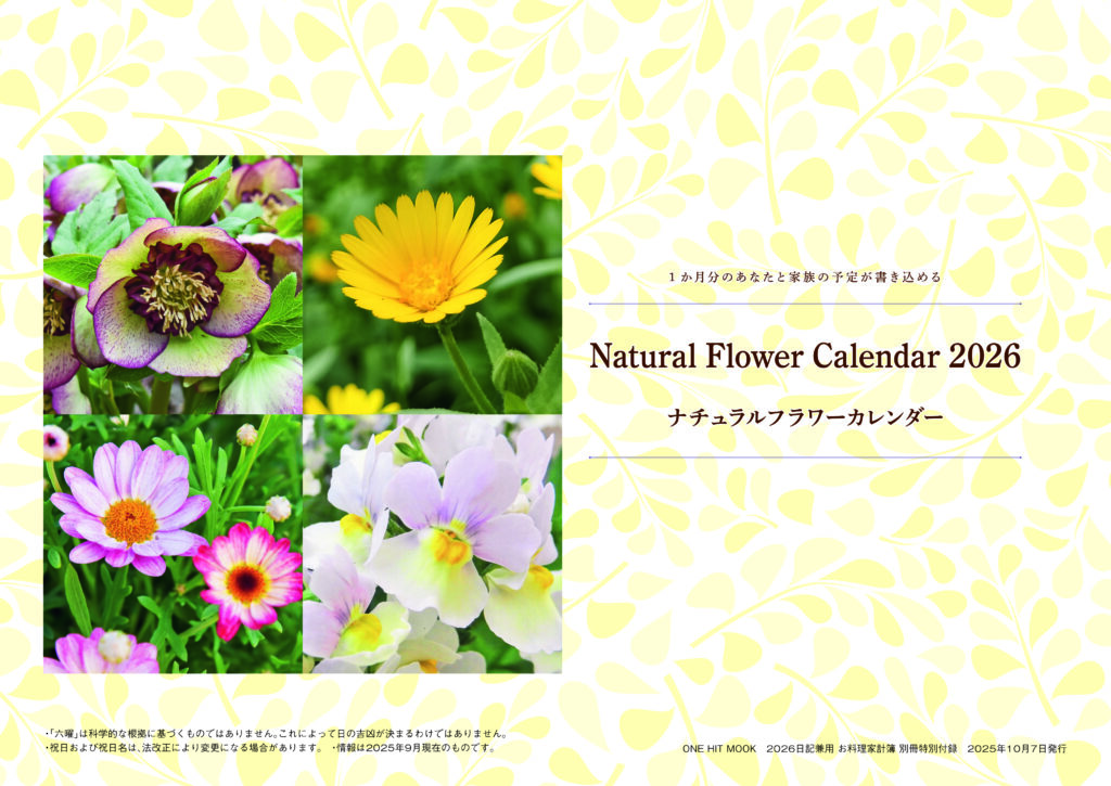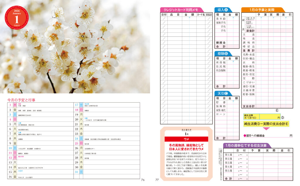 長年ご愛用いただいている家計簿ページは、今回も同じフォーマットで。給料日決算、月末決算でも自由に記帳できるので便利です。お花の写真と料理レシピも掲載していて、楽しく続けられます。毎日の家計簿のメモ欄に日記が書けるのも好評です。領収書ポケット、ナチュラルフラワーカレンダーの付録もついています。