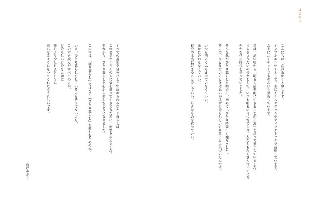 SNS総フォロワー数100万人越え、大人気インフルエンサーの高芦あかりさん初の著書。「独り暮らし」ではなく、「ひとり暮らし」を楽しむライフスタイルを提案する一冊。