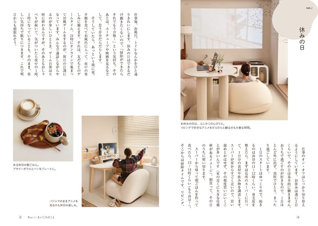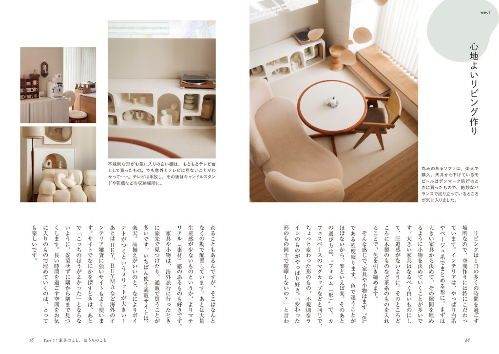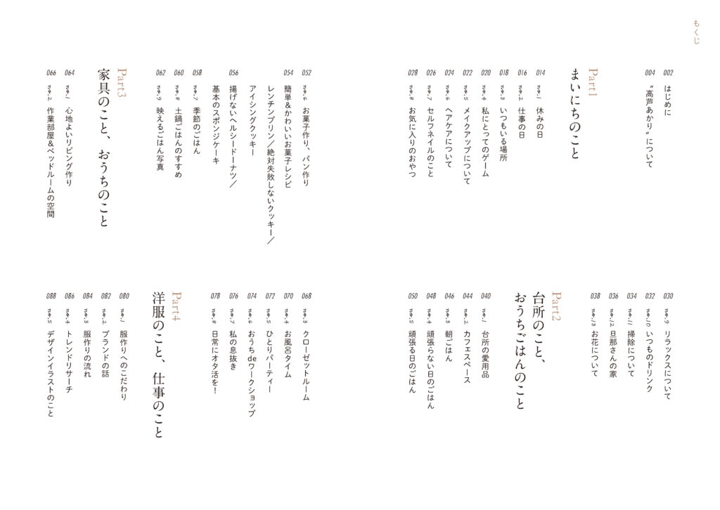 そんな高芦あかりさんはおうち時間が大好き。安心できて、長い時間を過ごす場所だからこそ、快適で愛おしい空間にしたい、好きなもので埋め尽くしたい。おうち作りやひとり時間の過ごし方、ライフスタイルのヒントがたっぷり詰まった本です。