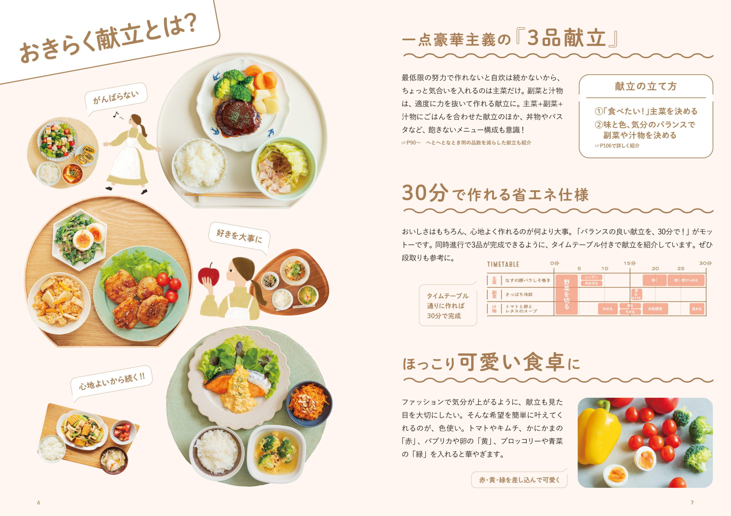 自炊を続けるためには、最低限の努力で作れることが大切。本書では、少しだけ気合いを入れるのは主菜だけにし、副菜と汁物はほどよく力を抜いて作る3品献立を提案しています。またバランスの良い献立を30分で作れるタイムテーブルもついているので段取りも参考になります。
