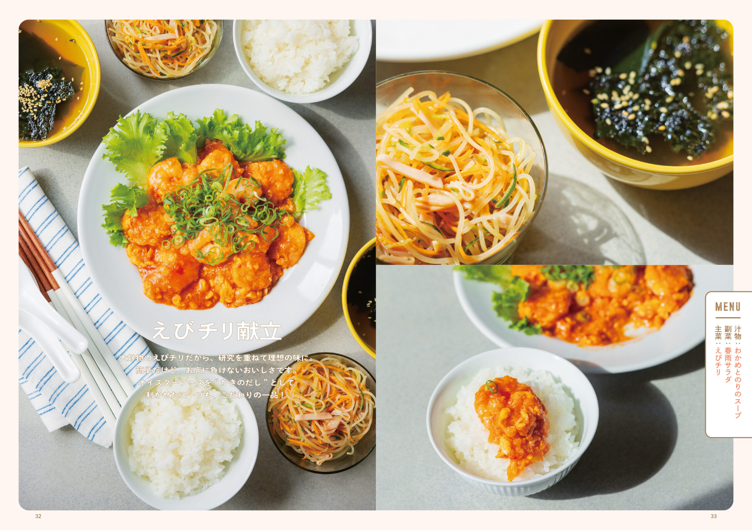 また、「えびチリ献立」は、大好物のえびチリを何度も研究してたどり着いた理想の味。簡単なのに、お店に負けないおいしさです。オイスターソースをかきのだしとして効かせたスープも、こだわりの一品。