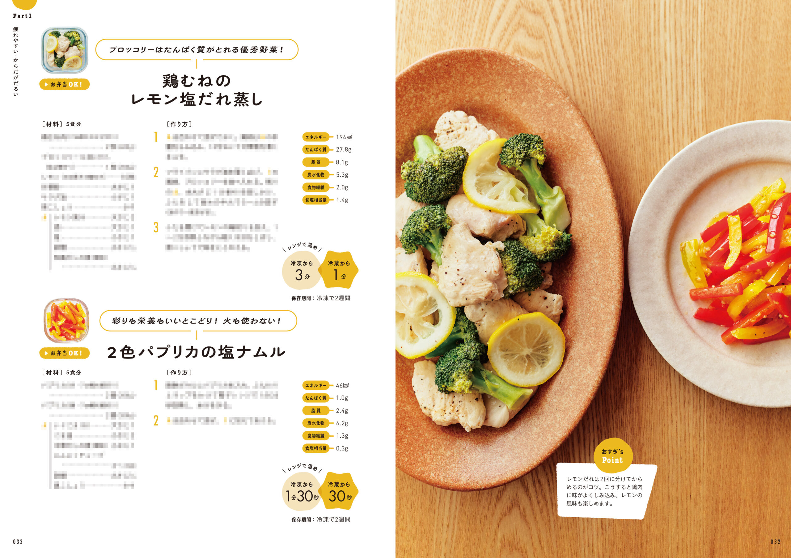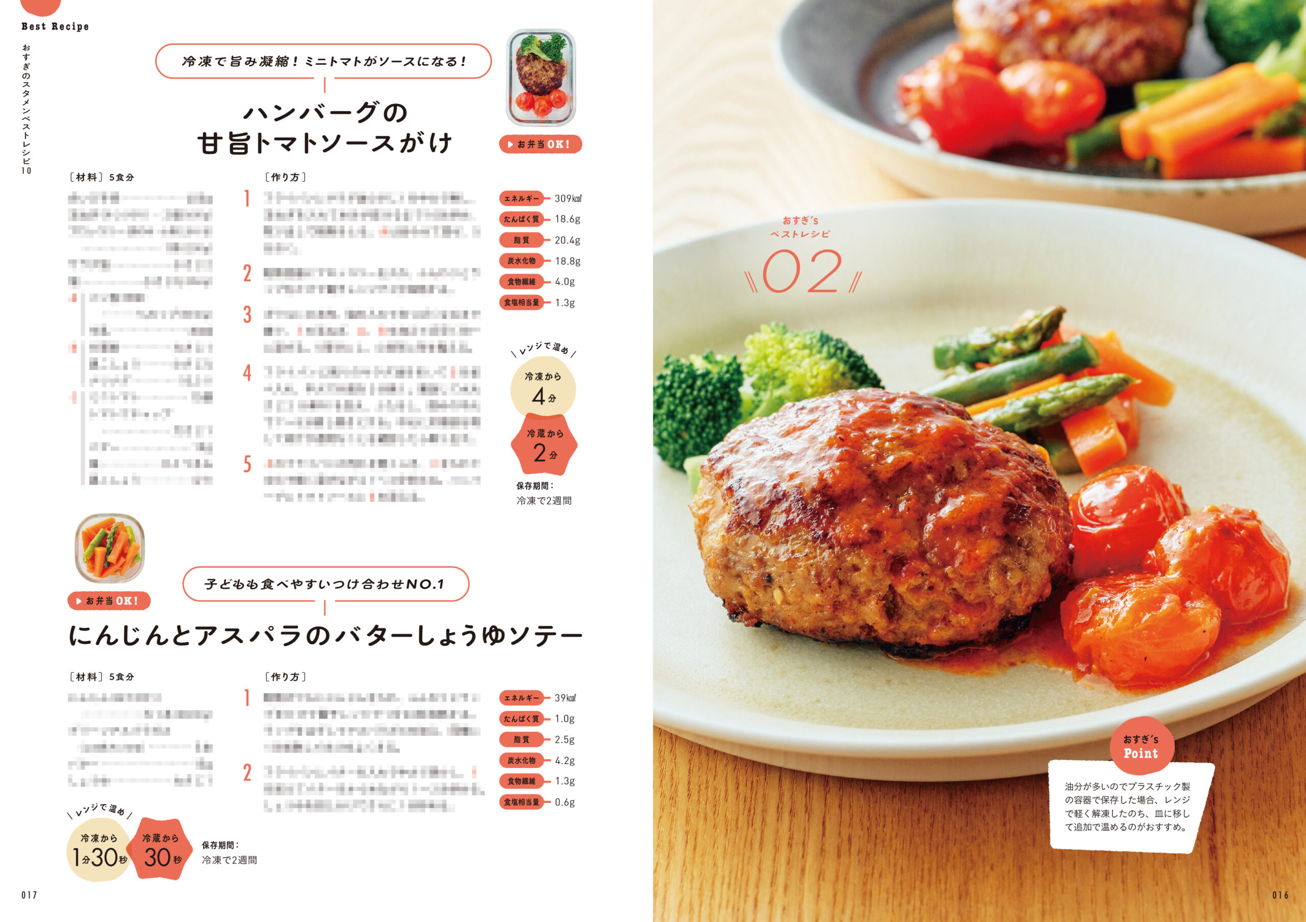 ごはんと一緒に保存容器につめて冷凍すれば「冷凍弁当」にもなるほか、習い事前の間食や夜食など、家族それぞれの暮らしに合わせて自由に活用することができます。栄養バランスとおいしさにこだわった全94レシピを掲載。ご要望が多かった、冷蔵庫にある食材からレシピを探せる便利な索引ページも!