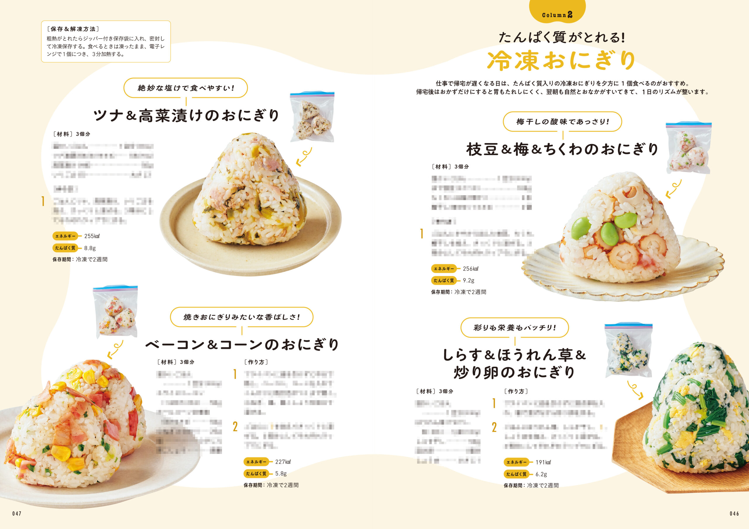 そのほか「たんぱく質がとれる冷凍おにぎり」や「レンチンで作る冷凍蒸しパン」など、YouTubeで人気のレシピをまとめたコラムも! 冷凍庫に常備しておくと便利な軽食レシピも多く掲載しています。
