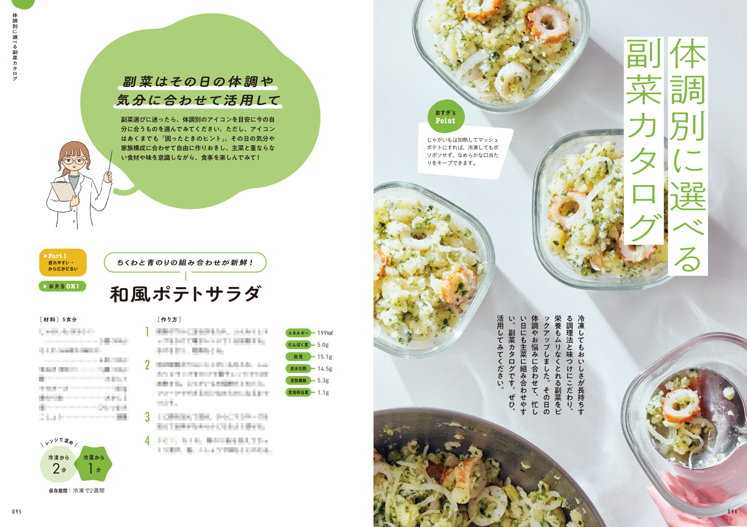 「野菜をたっぷり食べたい!」「冷凍作りおきを気軽に始めてみたい」という人におすすめの副菜カタログも充実。こちらも体調別に選べるアイコンつきです。冷凍してもおいしさが長持ちする素材と味つけを重視して厳選した、とっておきの新作レシピをピックアップ。その日の気分や主菜と重ならない味つけなど、好みや生活スタイルにあわせて自由に活用していただけます。