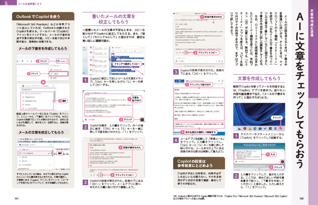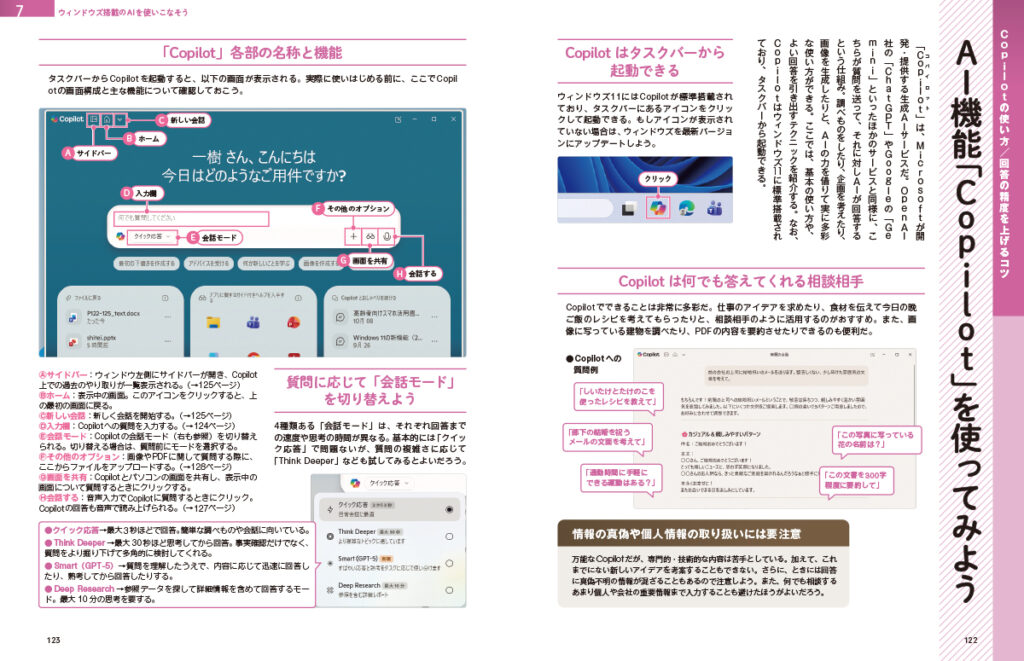 そんなCopilotに、アイデア出しや相談、調べもの、要約や翻訳など、様々な作業をお願いする方法とコツをていねいに解説。さらに画像やPDFについて質問したり、画像を生成してもらったりする手順についても紹介しています。