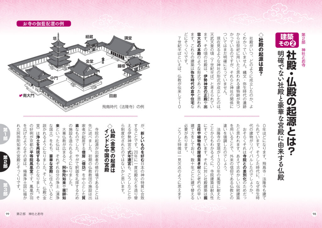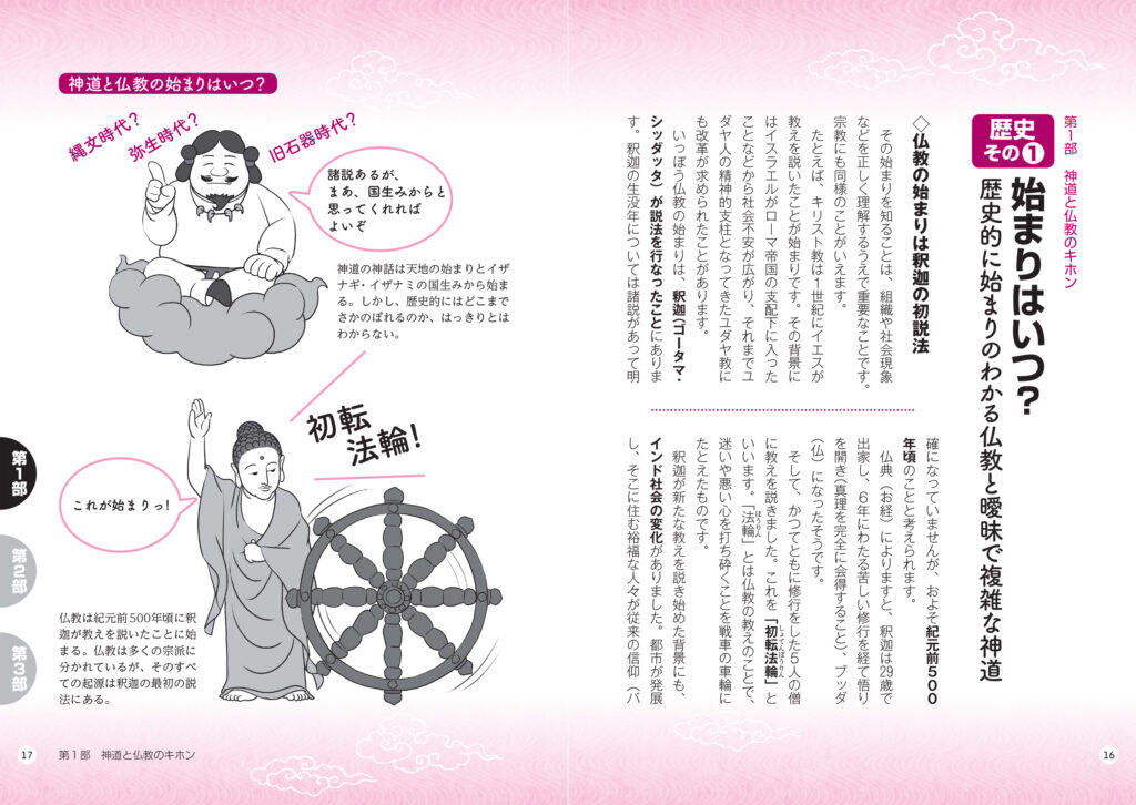 神道と仏教の歴史や教え、神様と仏様、神社とお寺の基礎知識から、それぞれの行事や儀礼、御神体と仏像、神仏習合などの深いつながりがわかる歴史の変遷までを、図解やイラストを交えながら、やさしく紹介しています。