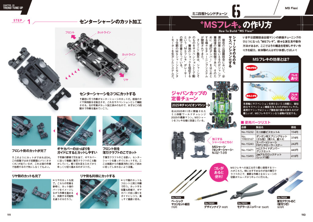 ミニ四駆 ジャパンカップなどで勝利を目指すために必須となるマシンチューンの方法をわかりやすく紹介。上級レーサーでは鉄板チューニングとなっている「MSフレキ」や「ボディ提灯」、「ATスラダン」も、これを読めば一目瞭然です!
