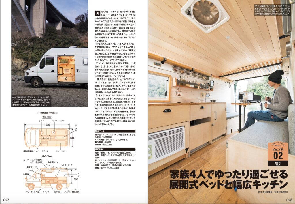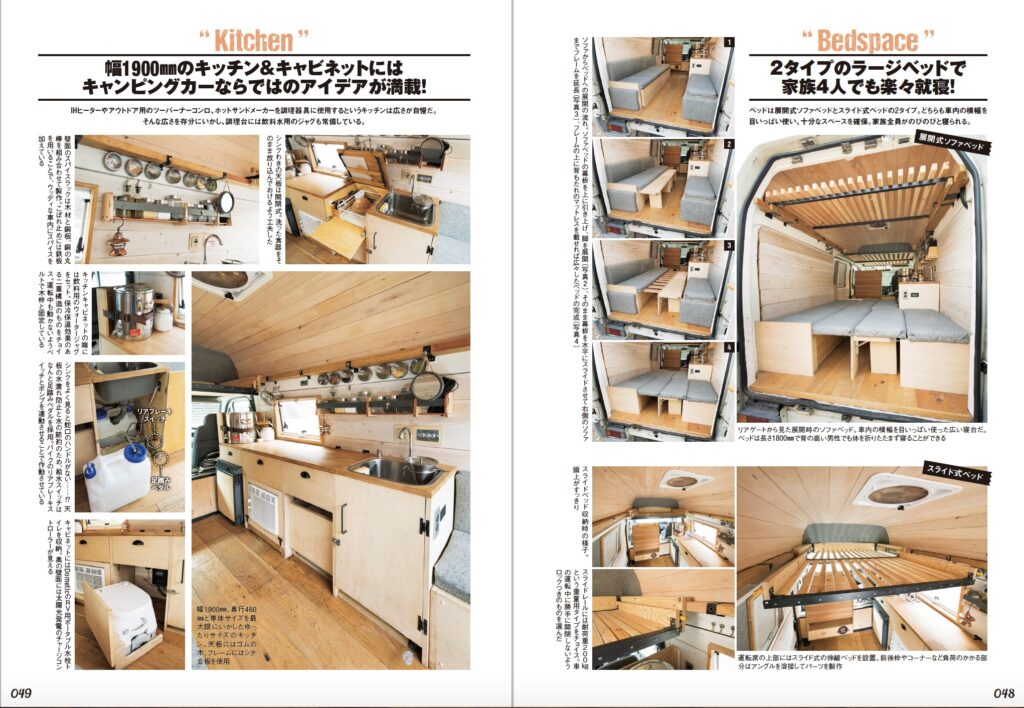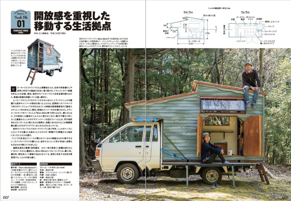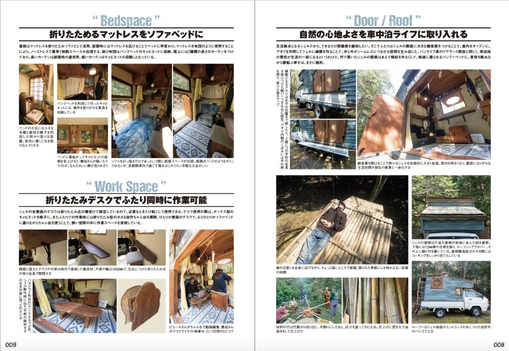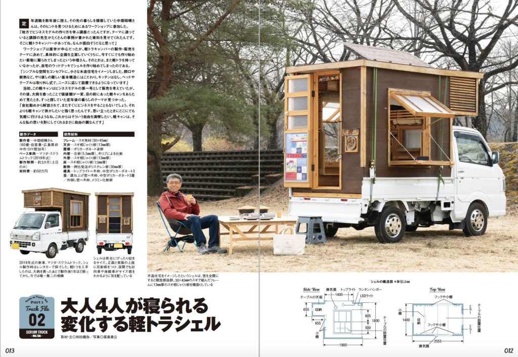 巻頭の「手作りキャンピングカー実例集」では、DIYにより車中泊仕様に変身したトラックとバンを計16台紹介。