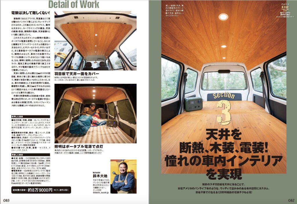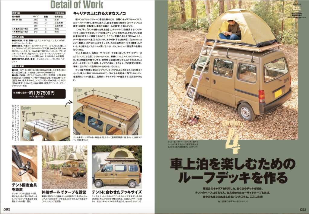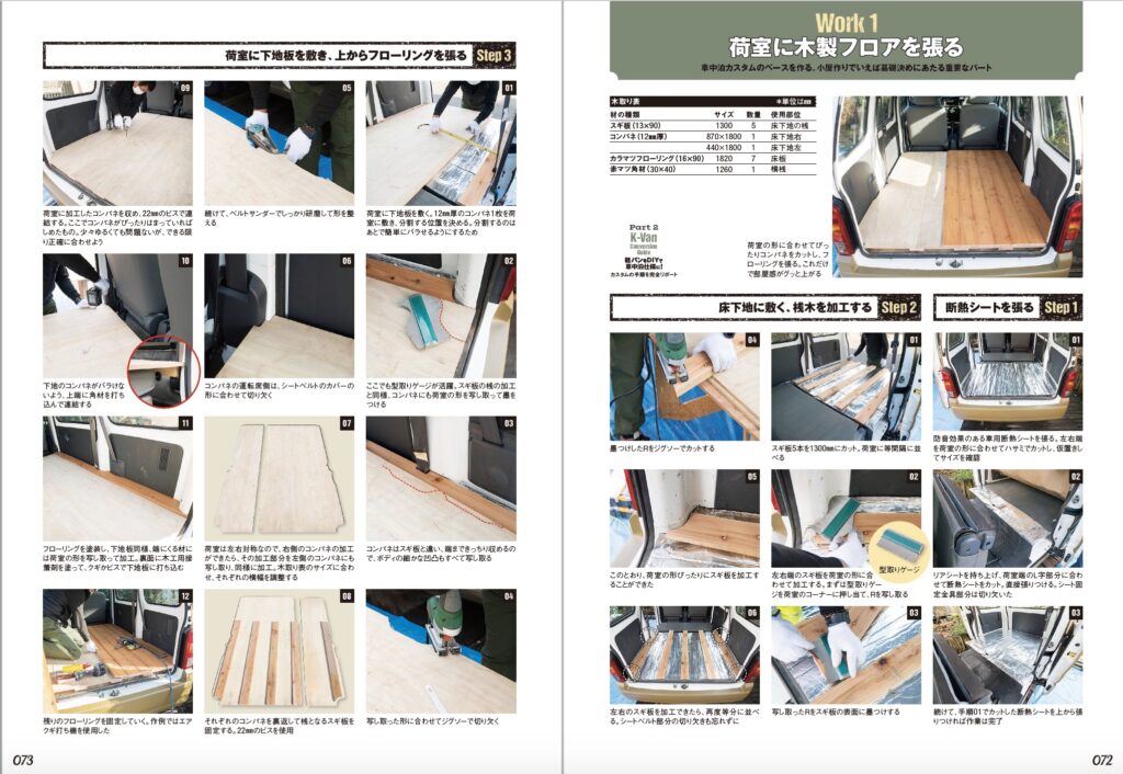 巻頭の実例集と並ぶ本書の目玉企画が、編集部が実際に軽バン(スズキ・エブリイ)を車中泊仕様にカスタムし、その作業手順を詳細に伝えるリポート記事です。