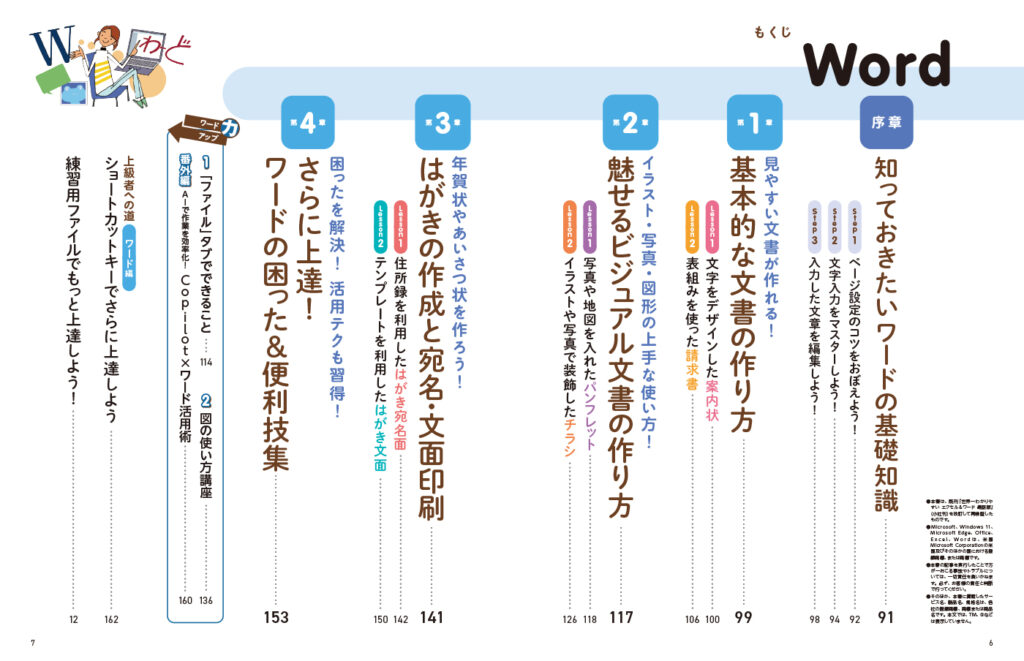本書は、表計算ソフトのエクセル編と文書作成ソフトのワード編の2部構成になっています。