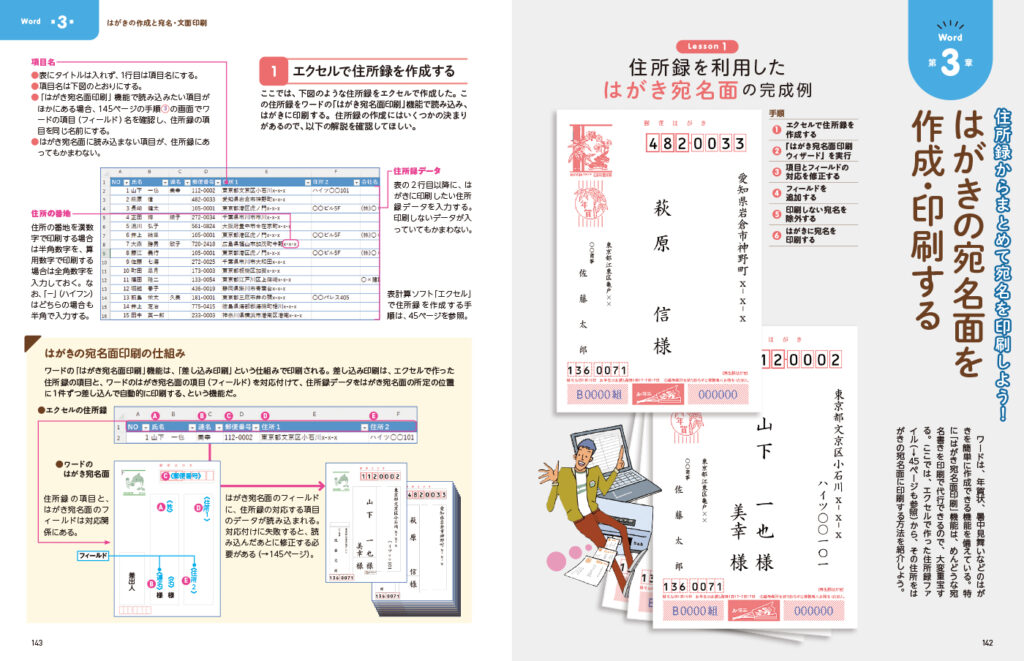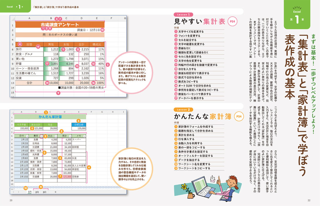 まずは、Officeを代表するこれら両ソフトの使い方を基礎から解説。そうして基本的な操作方法を学んだあとに、エクセルであれば「集計表」「家計簿」「住所録」「請求書」、ワードであれば「案内状」「パンフレット」「チラシ」「はがき」といった実用的な文書の作り方を通じて、応用的な操作方法や機能を習得できる点が特徴です。