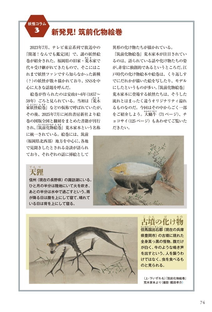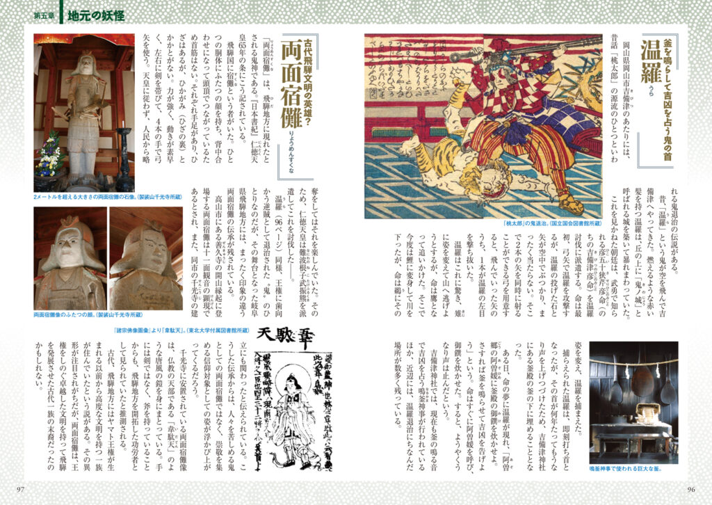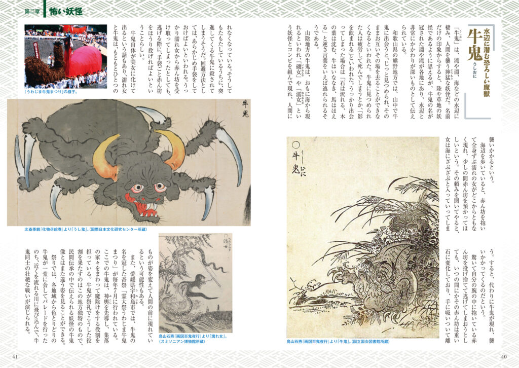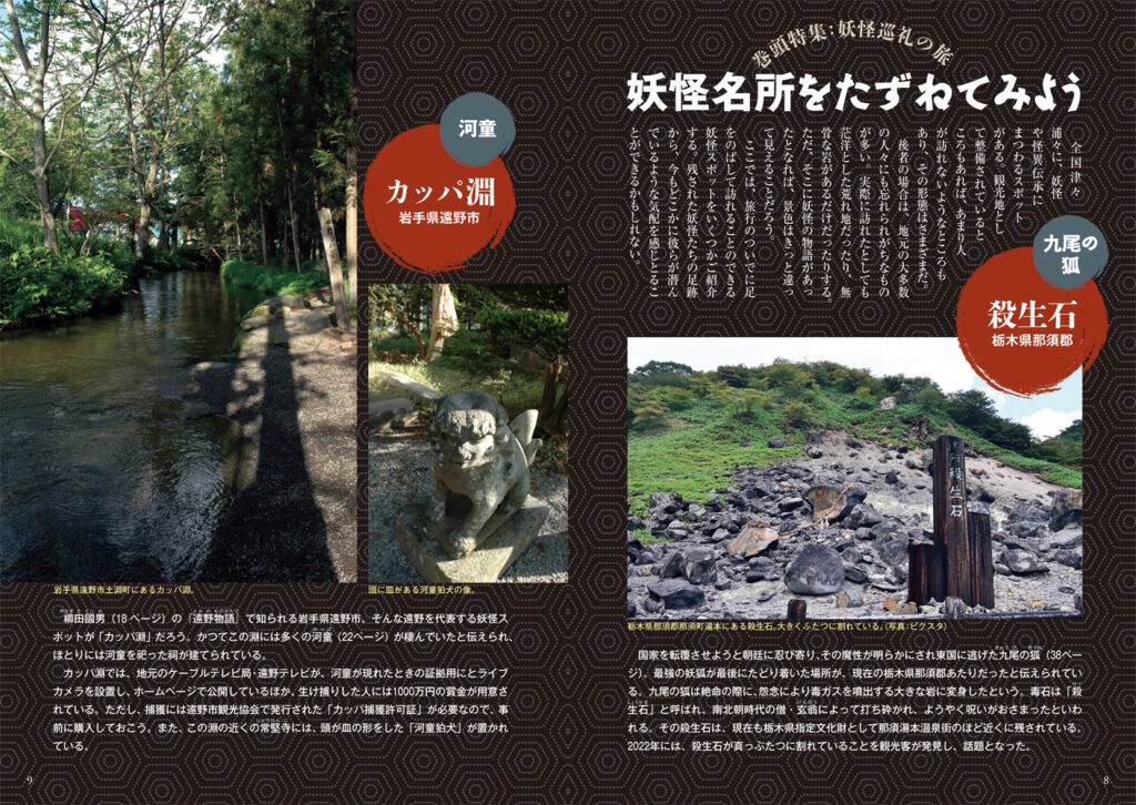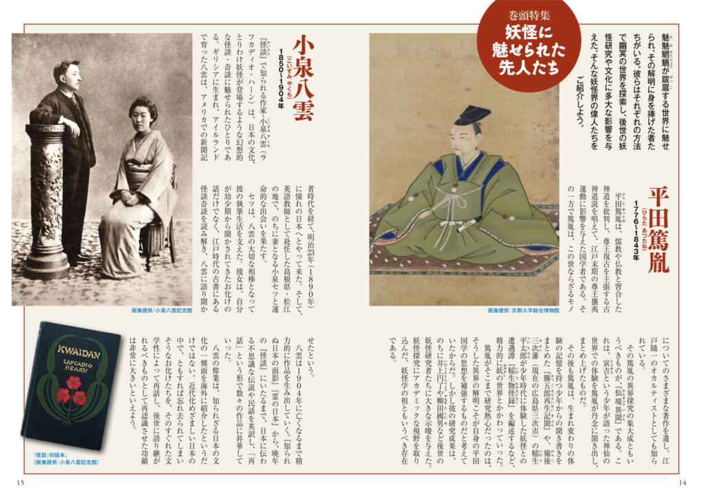 巻頭特集の「妖怪巡礼の旅」では、「カッパ淵」や「鬼ノ城」「鵺大明神」など、全国各地の妖怪伝承の残る土地を、妖怪の巡礼地として紹介。また、「妖怪に魅せられた先人たち」では、古の伝承の中に妖怪や怪異の姿を見出し、多くの作品を残した平田篤胤、小泉八雲、柳田國男といった研究家や、江戸後期から明治にかけて活躍した、鳥山石燕、葛飾北斎、月岡芳年など、妖怪の姿を生々しく描きだした絵師たちの業績を紹介しています。コラムでは、新発見の『筑前化物絵巻』のかわらしい妖怪も掲載。