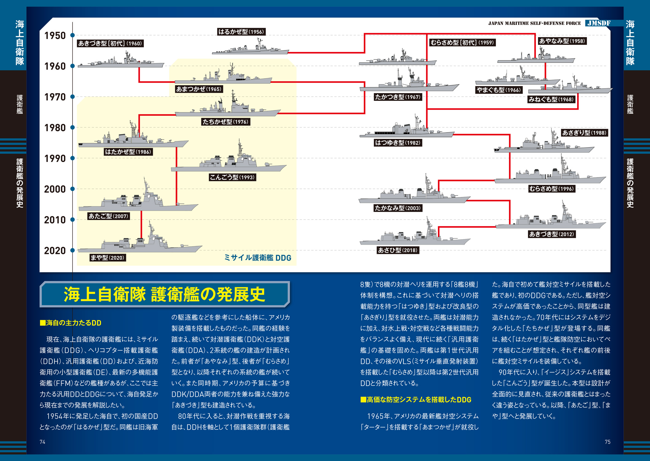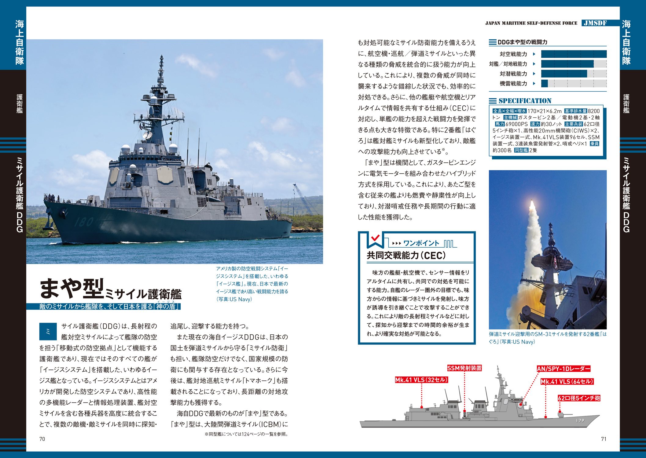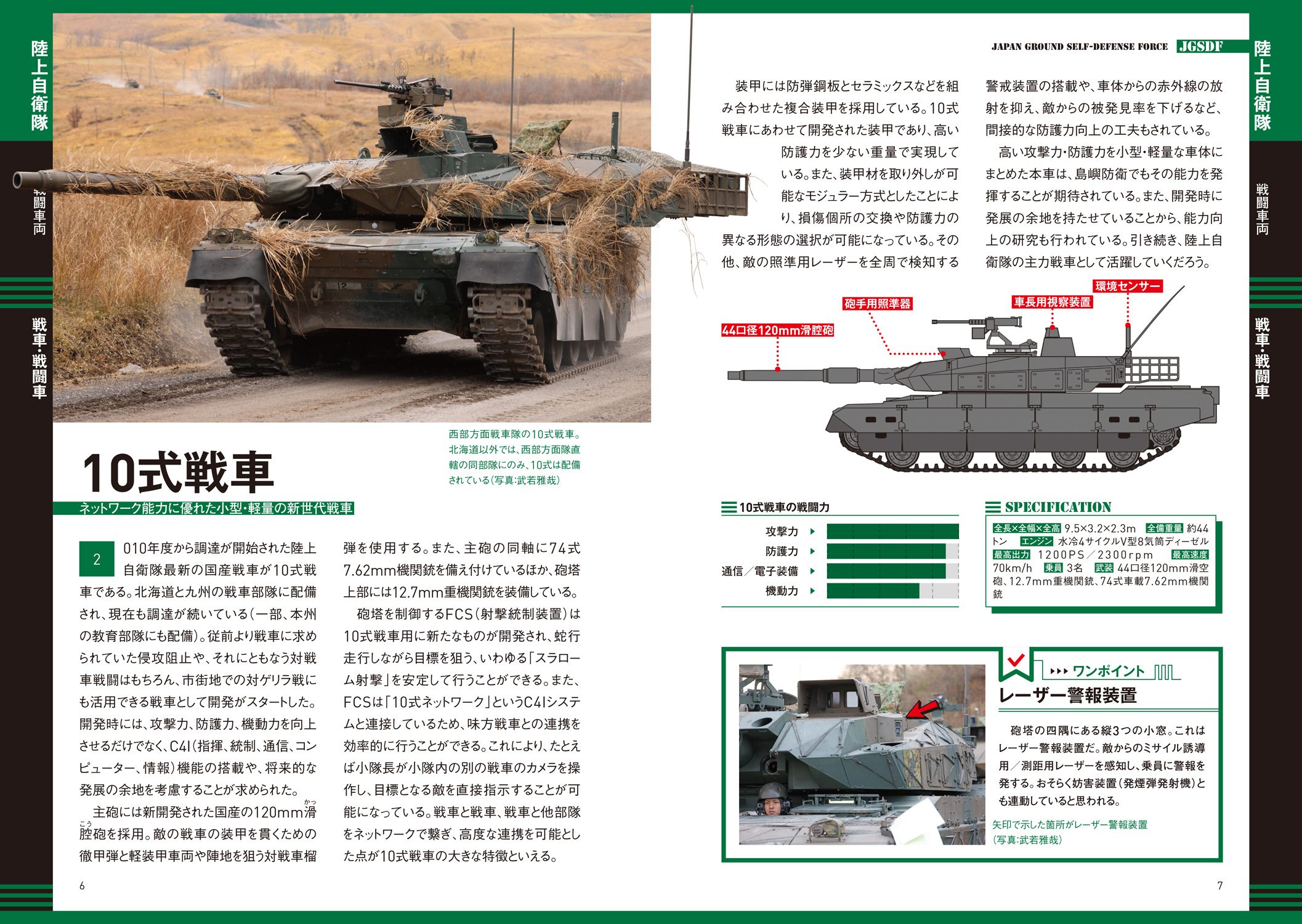 各装備には詳細スペックに加え、性能がひと目でわかる「戦闘力グラフ」を掲載。さらに戦車・装甲車、護衛艦、戦闘機は、自衛隊創設時から現代までの発達の流れをイラスト付きチャートで解説、時代背景を踏まえて、それぞれがどのように進化してきたかを知ることができます。単なる図鑑にとどまらない、“理解できる装備ガイド”です。