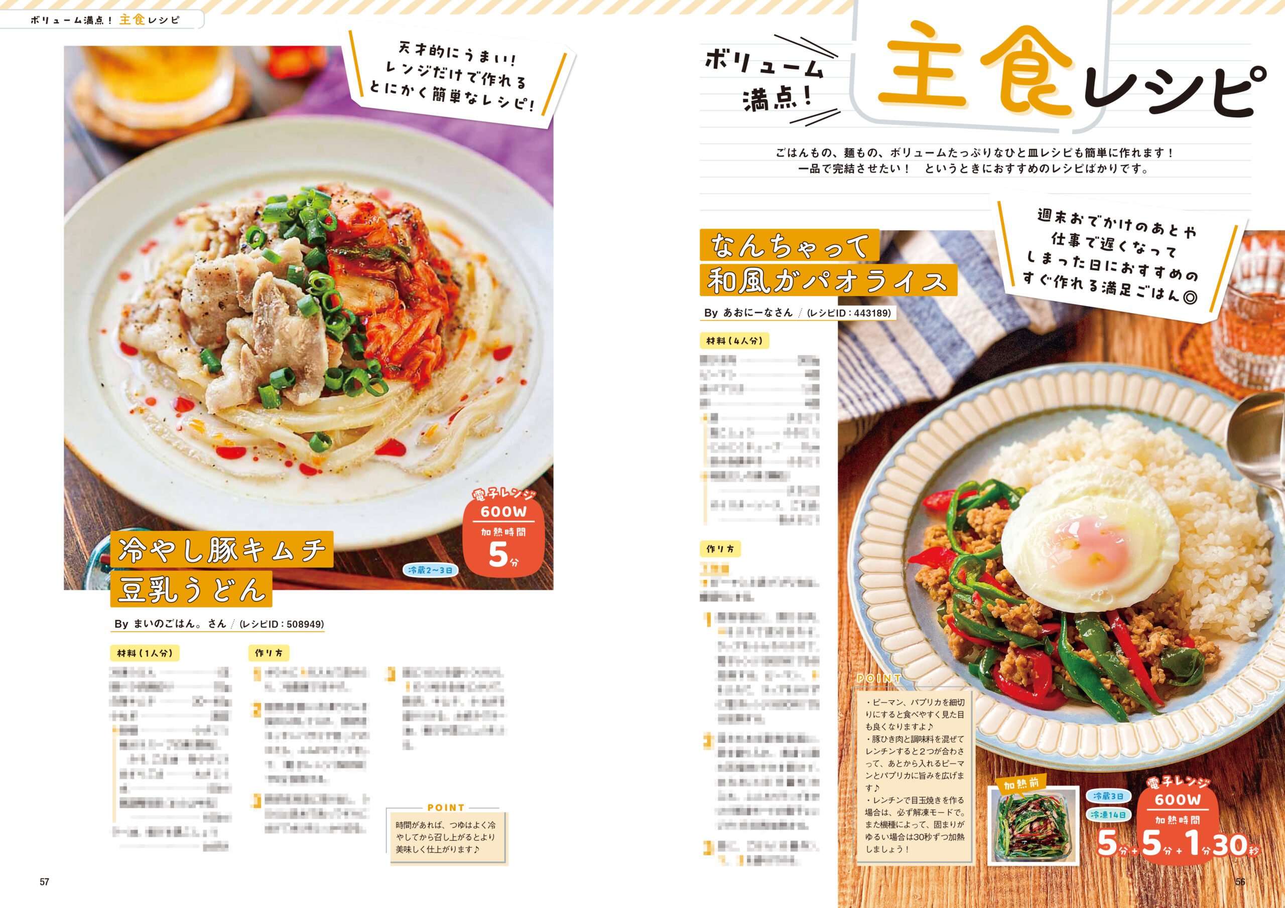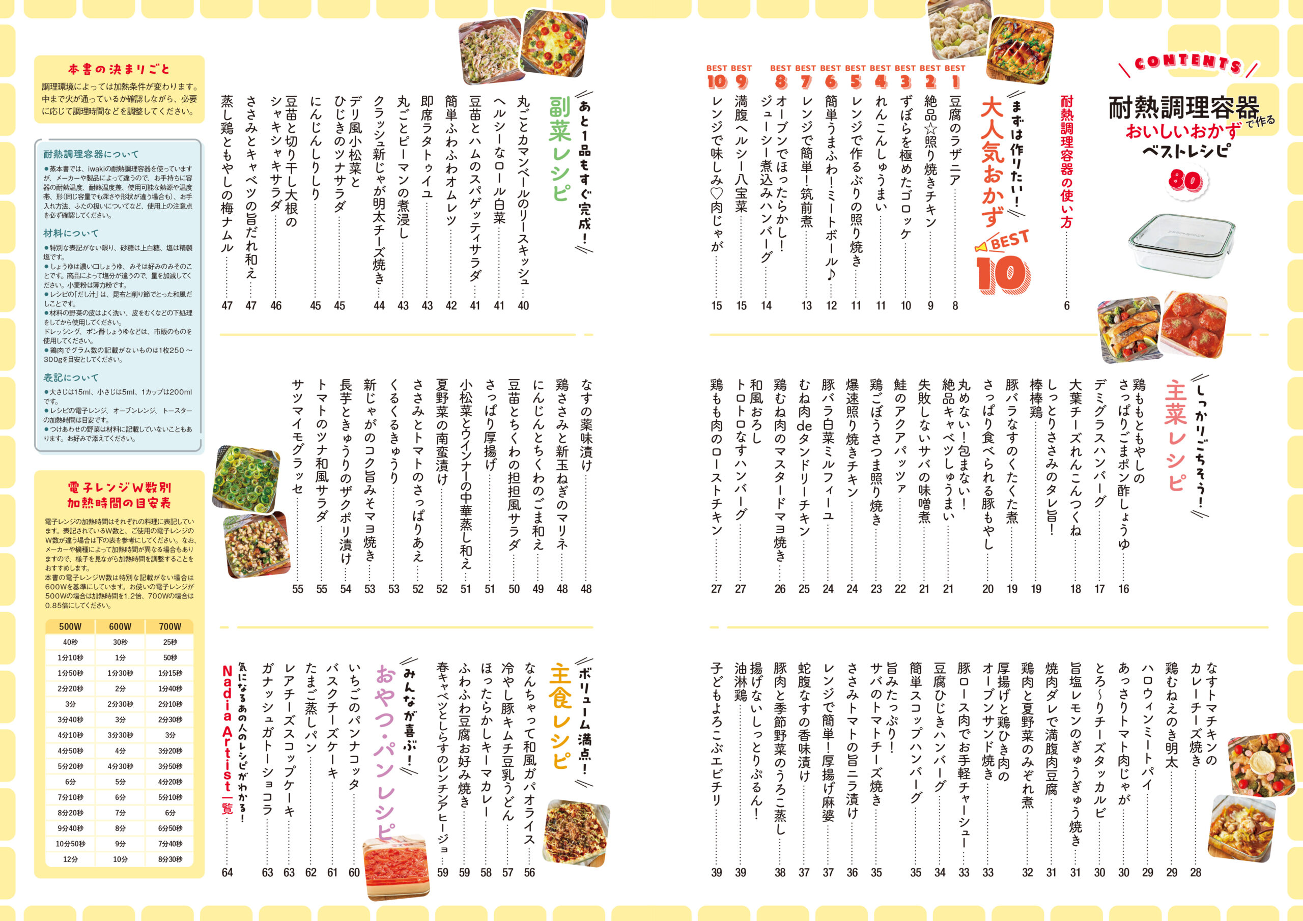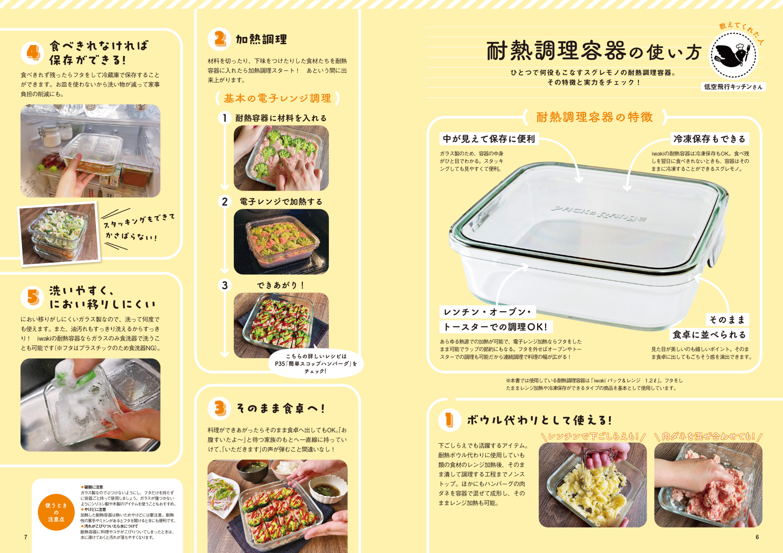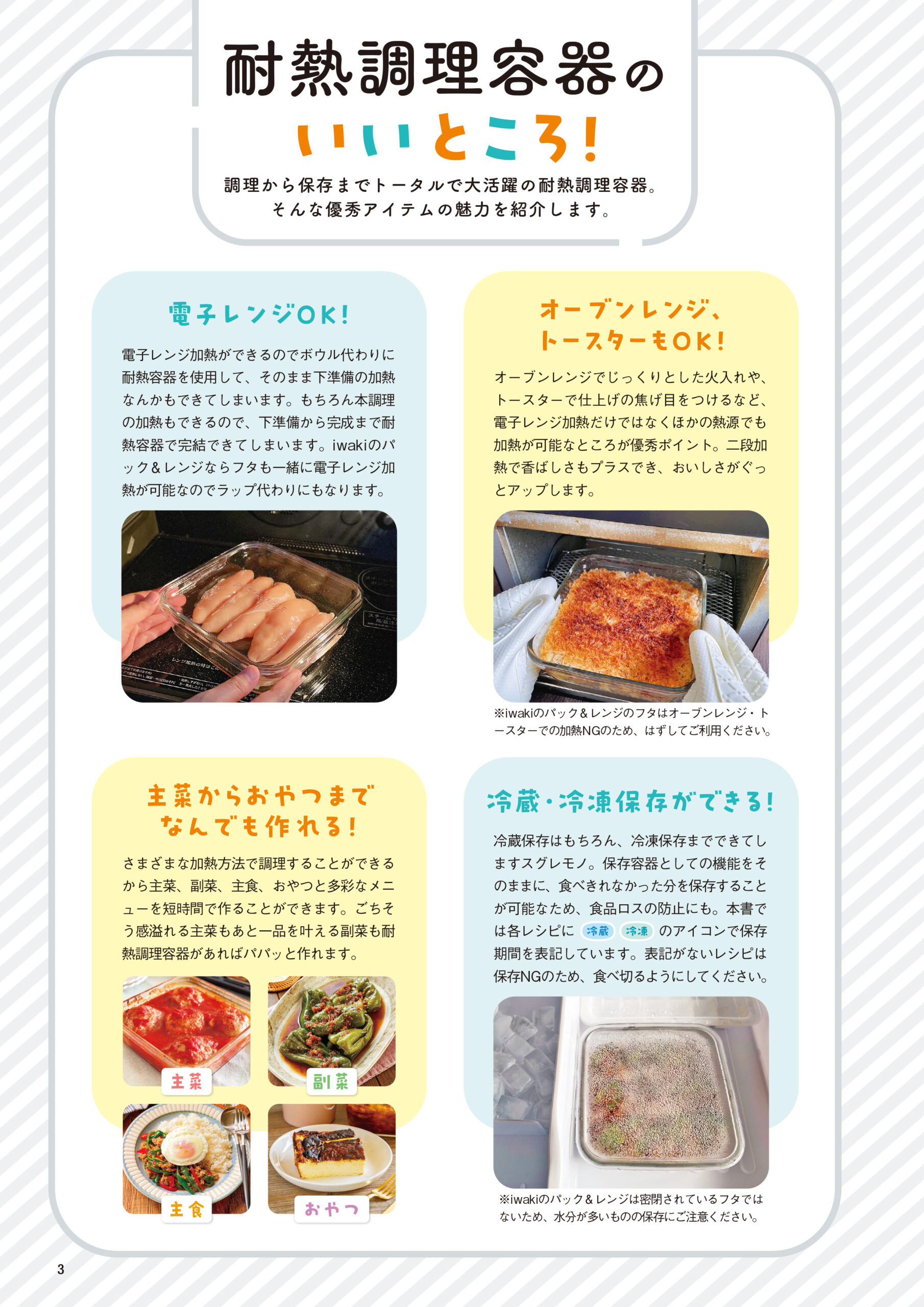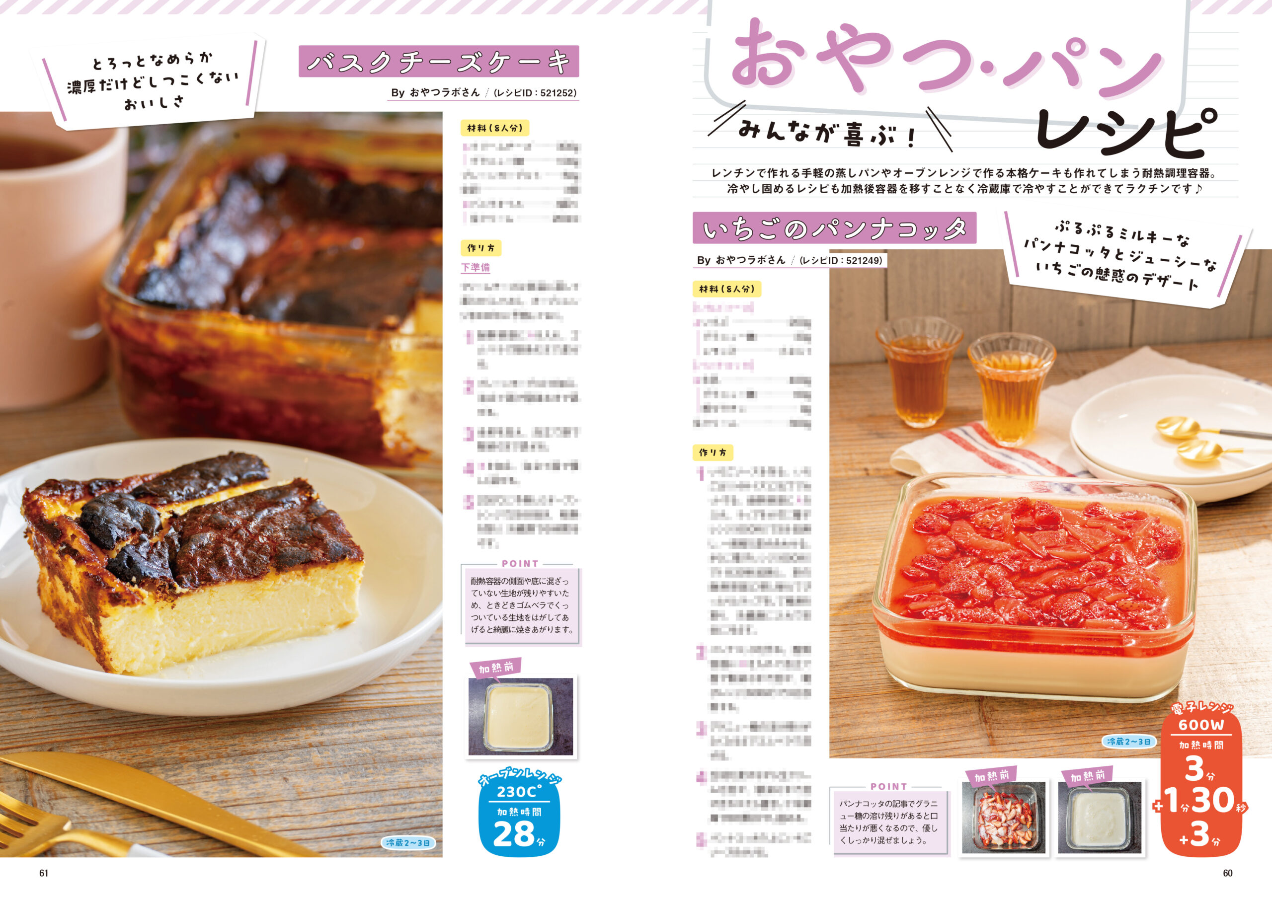 耐熱調理容器を使えば、毎日の主菜から副菜まで幅広く手軽に作れます。肉や魚、大豆製品、野菜を使った満足感のあるおかずはもちろん、あと一品欲しいときに便利な副菜レシピも掲載。オーブンで仕上げるごちそうメニューから、3分で完成する時短レシピ、火を使わずに作れる簡単レシピまで幅広く紹介します。さらに、ごはんや麺の一皿料理や、蒸しパン・ケーキなどのスイーツも手軽に調理可能。加熱後そのまま冷やせるため、後片付けも簡単です。