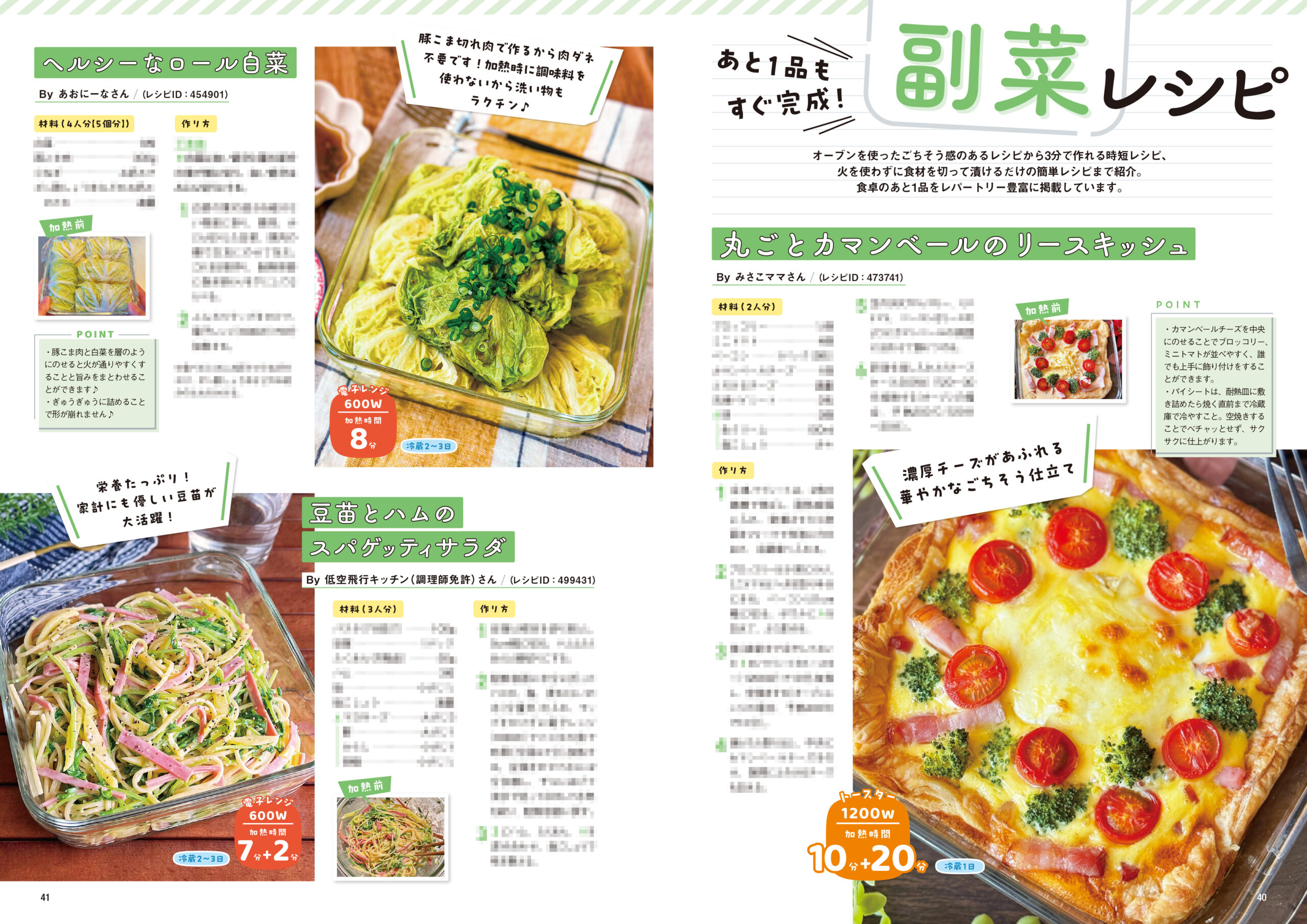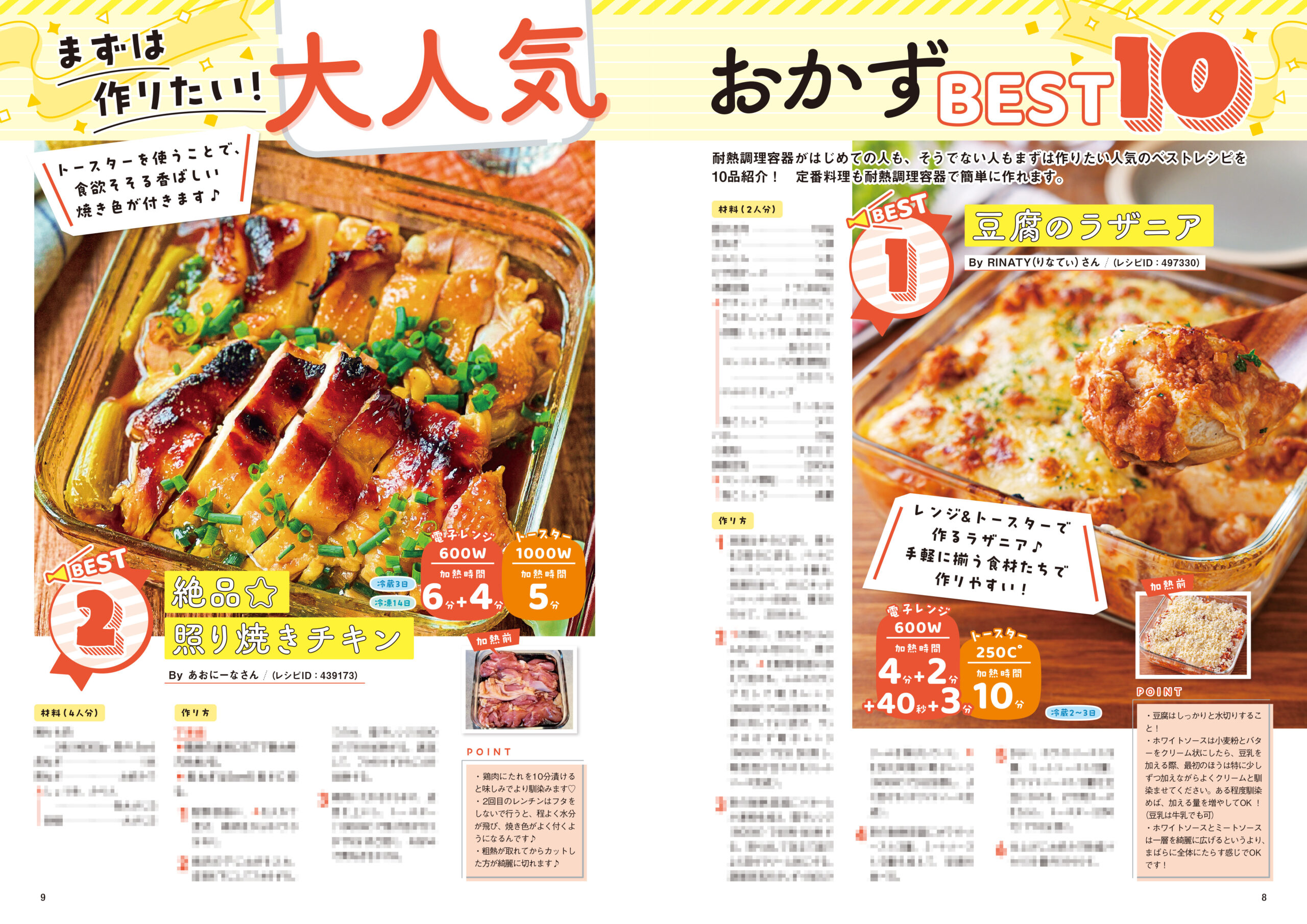 りなてぃさんの電子レンジとトースターで手軽に作れる「豆腐のラザニア」や、あおにーなさんのトースターで香ばしい焼き色に仕上げる「照り焼きチキン」など、普段のおかずにぴったりのメニューがそろっています。