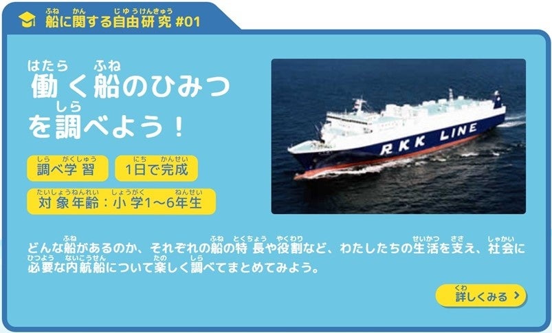 新生『ふれんどシップ』は、学研キッズネットで展開しているオンライン社会科見学「シゴトのトビラ」の動画コンテンツ2本にもアクセス可能になっており、普段見ることのできない貴重な船の内部の様子や船乗りの仕事について動画を通して知ることができます。こちらは子どもたちのキャリア教育にもご活用いただけます。