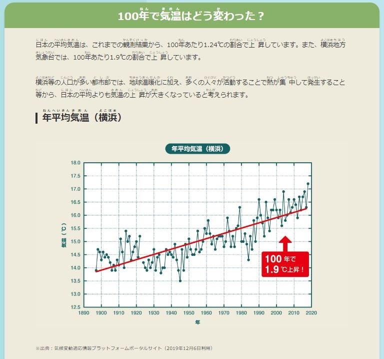 「ウェブ資料集」のカテゴリーでは、「100年で気温はどう変わった?」「脱炭素社会って何?」といった気候変動にまつわる“問い”とその解説・関連データを40以上紹介。すべての漢字にふりがながふられているため、学年を問わず活用いただきやすいです。