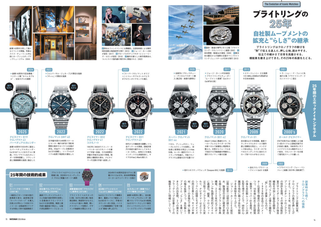 さらに21世紀から急速に普及していったマニュファクチュールムーブメントの進化の系譜からトレンドを読み解くコラムや歴代編集長からの特別寄稿、有名正規店店長による次世代定番大予測など、新旧織り交ぜた情報満載のスペシャル企画となっています。