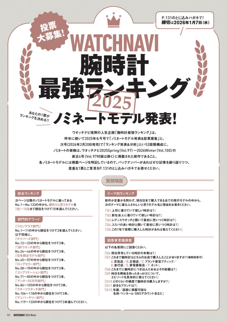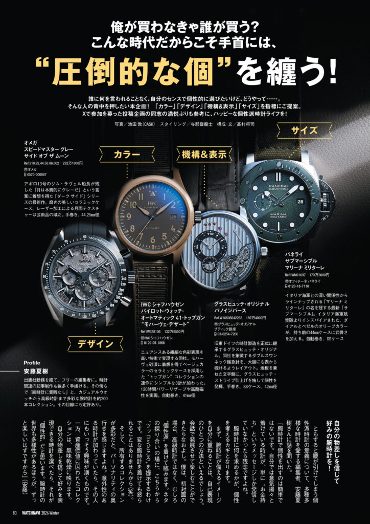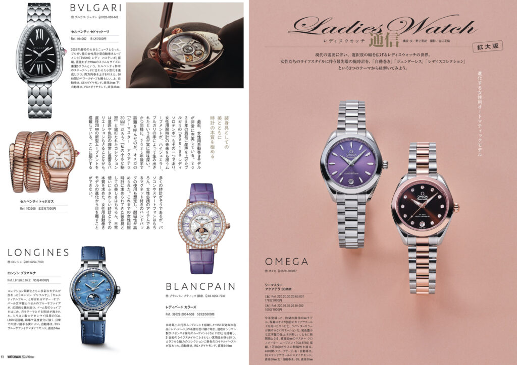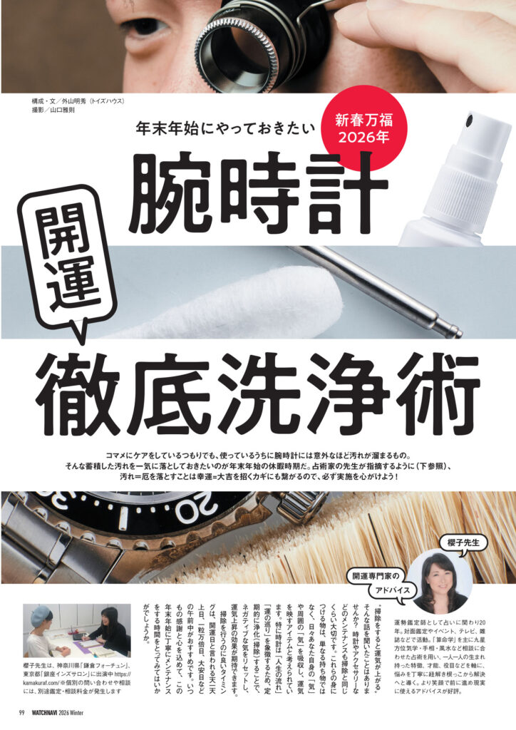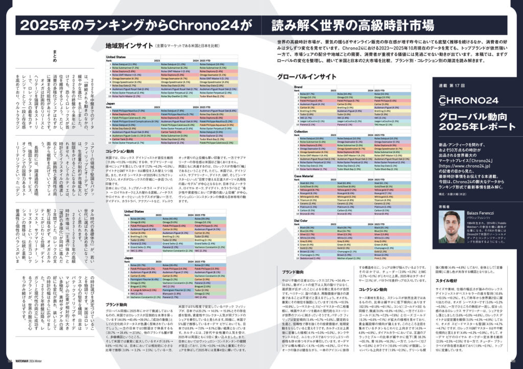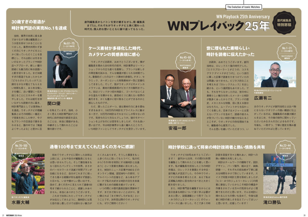 松山 猛氏と名畑政治氏が時計と文化を尋ねて各地を巡る「風来旅日記」や世界視点での時計トレンドを分析する「Chrono24 グローバル動向2025年レポート」など連載記事は今回も興味深いトピックスを掲載。高橋和幸カメラマンによる連載「ウオッチのWA!!!!!!」には現在の卓球人気の礎を築いた“愛ちゃん”こと福原 愛さんが出演しています。