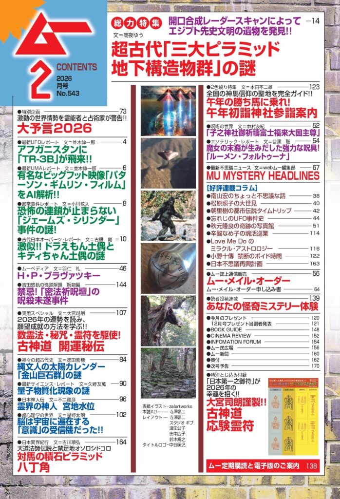 2色刷り特集 午年初詣神社参詣案内/実用スペシャル 古神道 開運秘伝/特別とじ込み付録 大宮司朗謹製!! 古神道応験霊符/アフガニスタンに「TR-3B」が飛来!!/縄文人の太陽カレンダー「金山巨石群」の謎/量子物質化現象の謎/対馬の積石ピラミッド 八丁角/激似!! ドラえもん土偶とキティちゃん土偶の謎/脳は宇宙に偏在する「意識」の受信機だった!!/霊界の神人 宮地水位 ほか