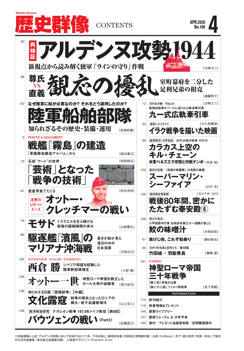 その他、第三特集「陸軍船舶部隊~知られざるその歴史・装備・運用」以下、貴重写真で見る「戦艦『霧島』の建造」、「モサド」、幕末に生起した日露の「国境紛争」の発端となったロシアの樺太・南千島襲撃事件の実態を描く「文化露寇」、今年1月頭に突如実施された米軍ベネズエラ強襲作戦の成功の理由を考察する「カラカス上空のキル・チェーン」、神聖ローマ帝国を樹立した「オットー一世」ほか、興味深い記事多数を掲載しています。