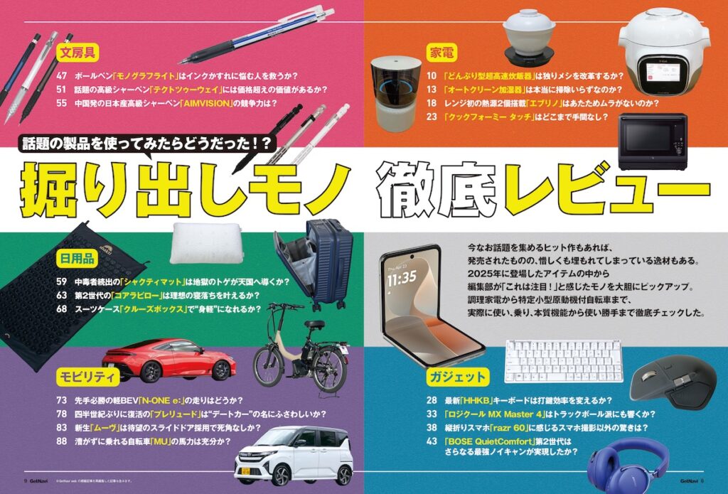 話題ヒット作や発売されたものの、イマイチ“日の目”を見ていない知られざる良品まで、2025年に登場したアイテムのなかから、編集部が「これは注目!」と感じたモノを大胆にピックアップ! 漕がずに乗れる自転車として注目を集める「MU」や、ほったらかし調理家電がお手頃プライスで手に入ると高評価の「クックフォーミー タッチ」、スライドドア初採用でもはや死角なしの新「ムーヴ」など、実際に使い、乗り、本質機能から使い勝手まで徹底チェックした。