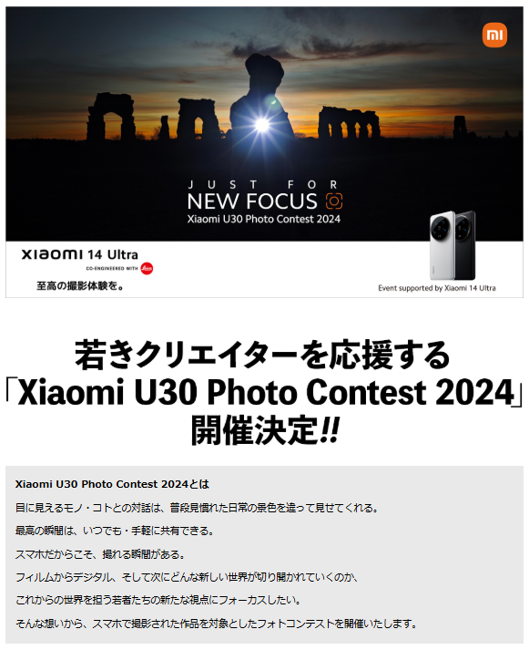 『Xiaomi』のブランドは、現在では日本国内でも数多くの家電・AV機器を展開している。一気に人気ブランドに成長したわけだが、そのきっかけとなったのがカメラ機能においてLeicaと共同開発したスマートフォンの発売だった。そのプロモーションにおいて「Xiaomiは若いクリエイターを応援していく」という企業マインドを示すプロジェクトとして、30歳以下の若者向けのフォトコンテストを『CAPA』とのコラボで実施した。